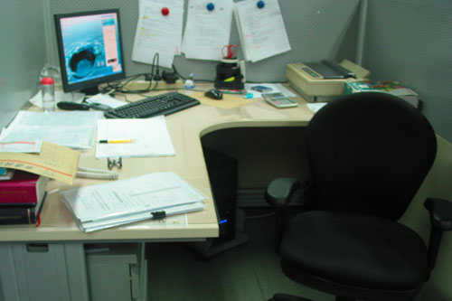 D.杂乱无章的办公桌